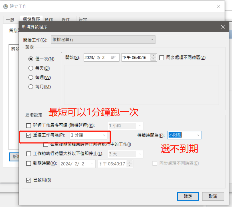 去把剛剛做的.bat自動執行檔案選起來,這樣時間到了他就跑一次,直到你硬碟掛掉,或是電腦關機。